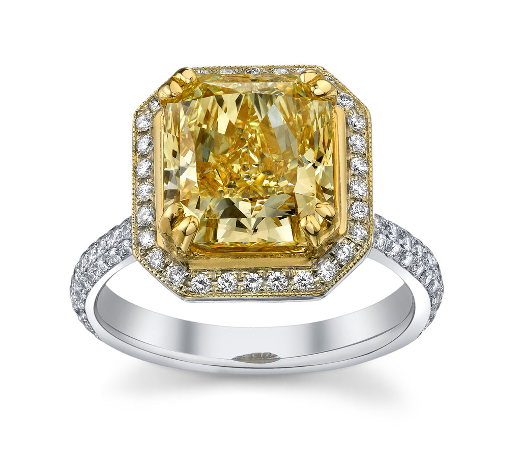 18k white & yellow gold ring that will fit a 4 carat center diamond. Sample center diamond shown is a Breathtaking Radiant Fancy Intense Yellow VVS diamond weighing 4 carats mounted on 18k ring. *Price is for ring only. Center diamond sold separately